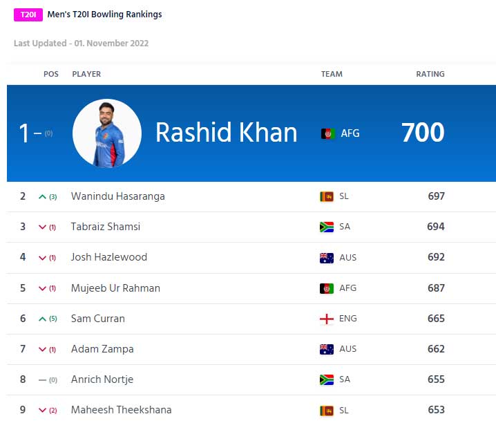 ඇෆ්ගනිස්තාන ක්රීඩක රෂීඩ් ඛාන් තවදුරටත් විස්සයි විස්ස පන්දු යවන්නන්ගේ ශ්රේණිගත කිරීම්වල පළමු ස්ථානයේ පසුවෙයි.